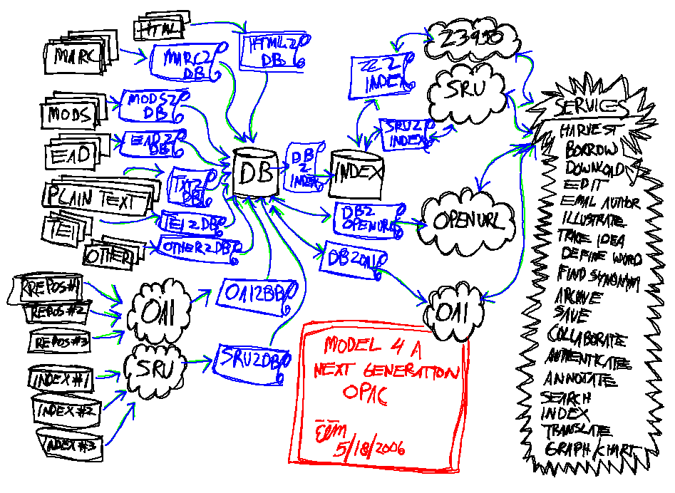 What is the purpose of our libraries? Why do they exist? What is/are the problem(s) librarianship is trying to solve? The answers to such questions are not definitive, especially when applied to individual libraries, but taken en masse the answers probably surround sets of services provided to a hosting community. If you work in a school library, then your community includes the people in the school. If you work in an academic library, then the community is a college or university. If you work in a public library, then the community is your local municipality. And even though each library supports a different community, there are sets of common functions which all libraries facilitate including collection, preservation, organization, and dissemination. We apply these processes to data, information, and knowledge in a variety of forms and formats. Libraries collect, preserve, organize, and disseminate content for the purposes of making the work of their respective communities easier whether that work be learning, teaching, or research. To one degree or another, just about every library does this sort of work, and just about everything us librarians do can be associated with one of these processes.